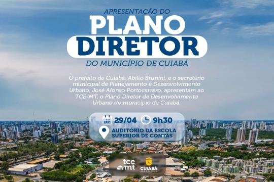 A Prefeitura de Cuiabá apresentará ao Tribunal de Contas de Mato Grosso (TCE-MT) a proposta do novo Plano Diretor de Desenvolvimento Urbano de Cuiabá. O encontro será nesta quarta-feira (29), no auditório da Escola Superior de Contas, a partir de 9h30.